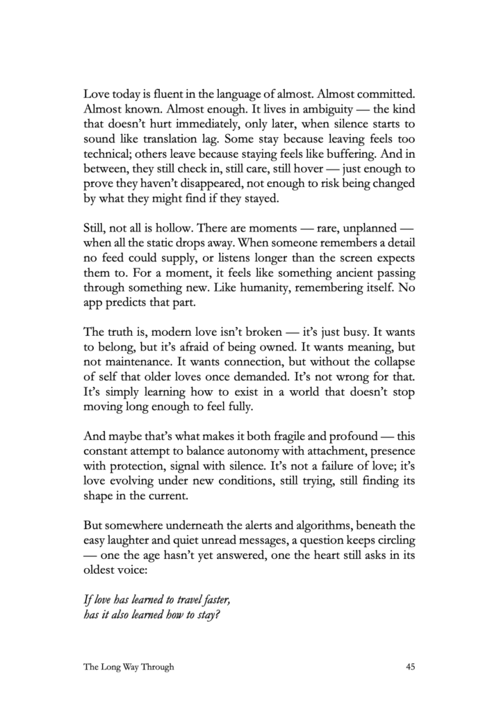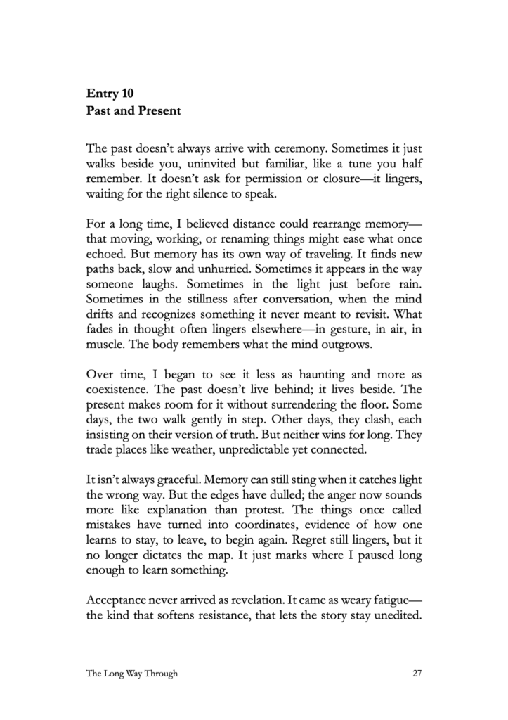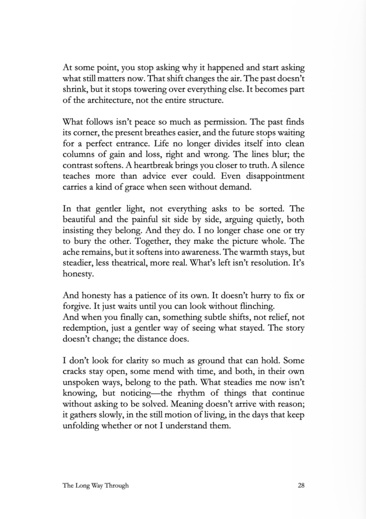 The Long Way Through doesn’t promise closure. It opens a space for recognition — for the subtle ways loss and becoming overlap, for the truths that stay half-lit even when they finally come into view.