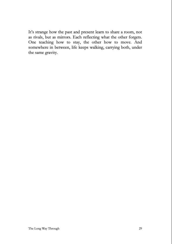 Written in poetic prose, the reflections trace how grief, love, and time bend the human spirit without breaking it. They don’t search for redemption, only perspective — a quieter kind of knowing that unfolds softly in the spaces between what was and what comes next.