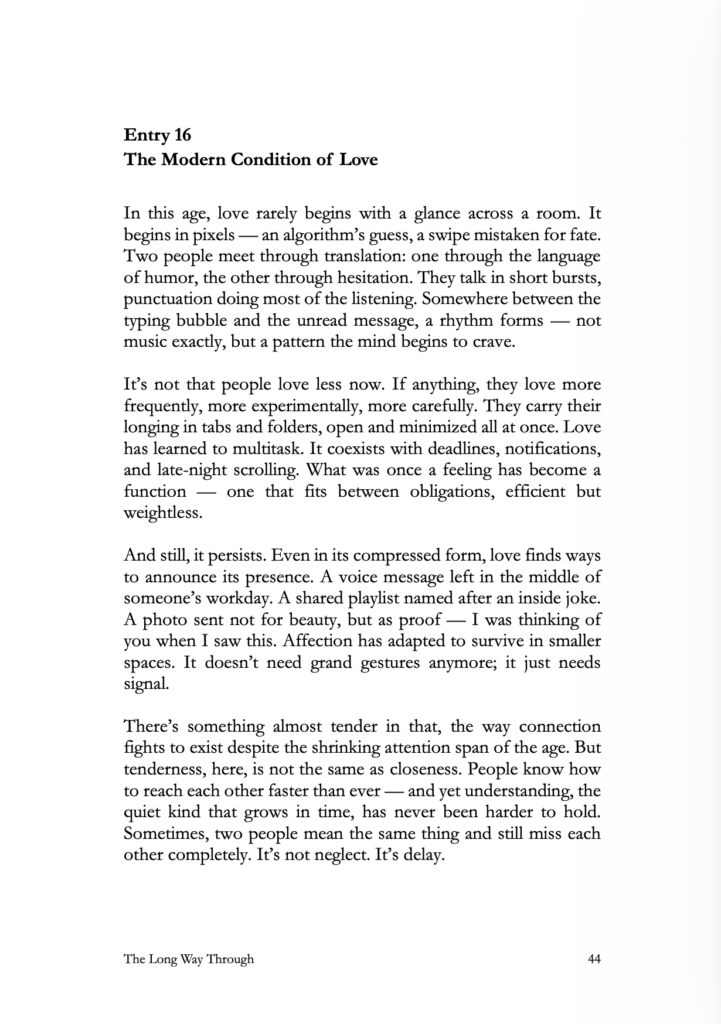 The pages don’t try to simplify emotion or turn it into something neat. They let it breathe — raw, contradictory, and true — reminding that awareness, even when uncertain, can still bring a kind of peace that feels earned, not given.